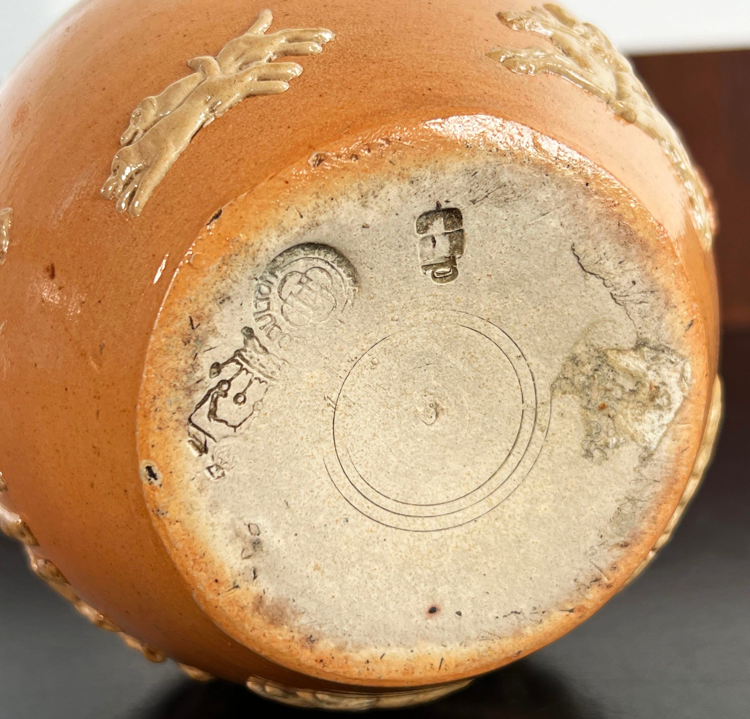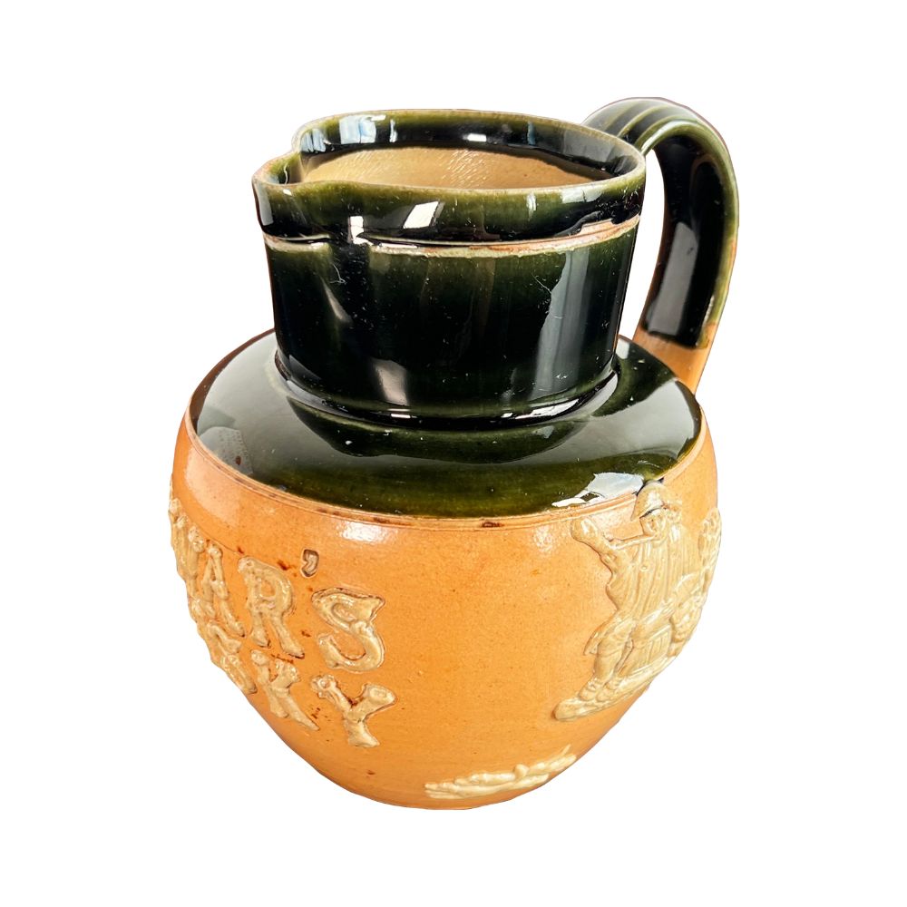 Fabulous antique Dewar’s Whiskey advertising pitcher by Royal Doulton, c.1900-1910! Lovely salt glaze on the stoneware, with embossed figures all around the outside of the jug. It measures 5″ tall and 4 3/4″ wide, and is in very good vintage condition as shown in the photographs, with age appropriate wear throughout but no chips or cracks!
