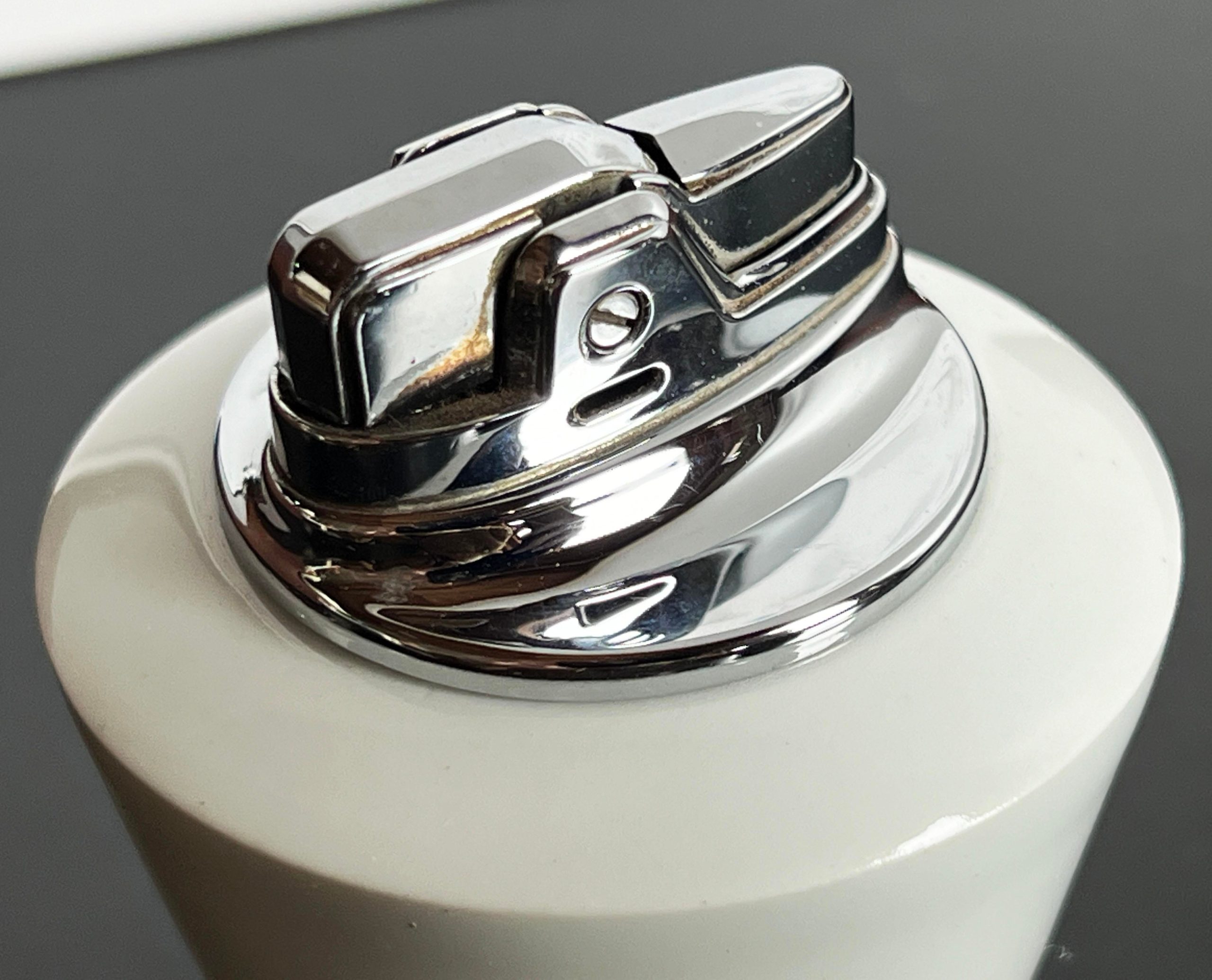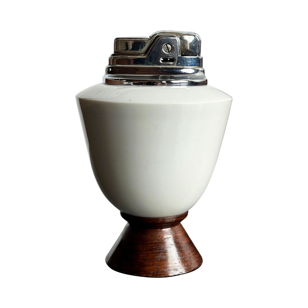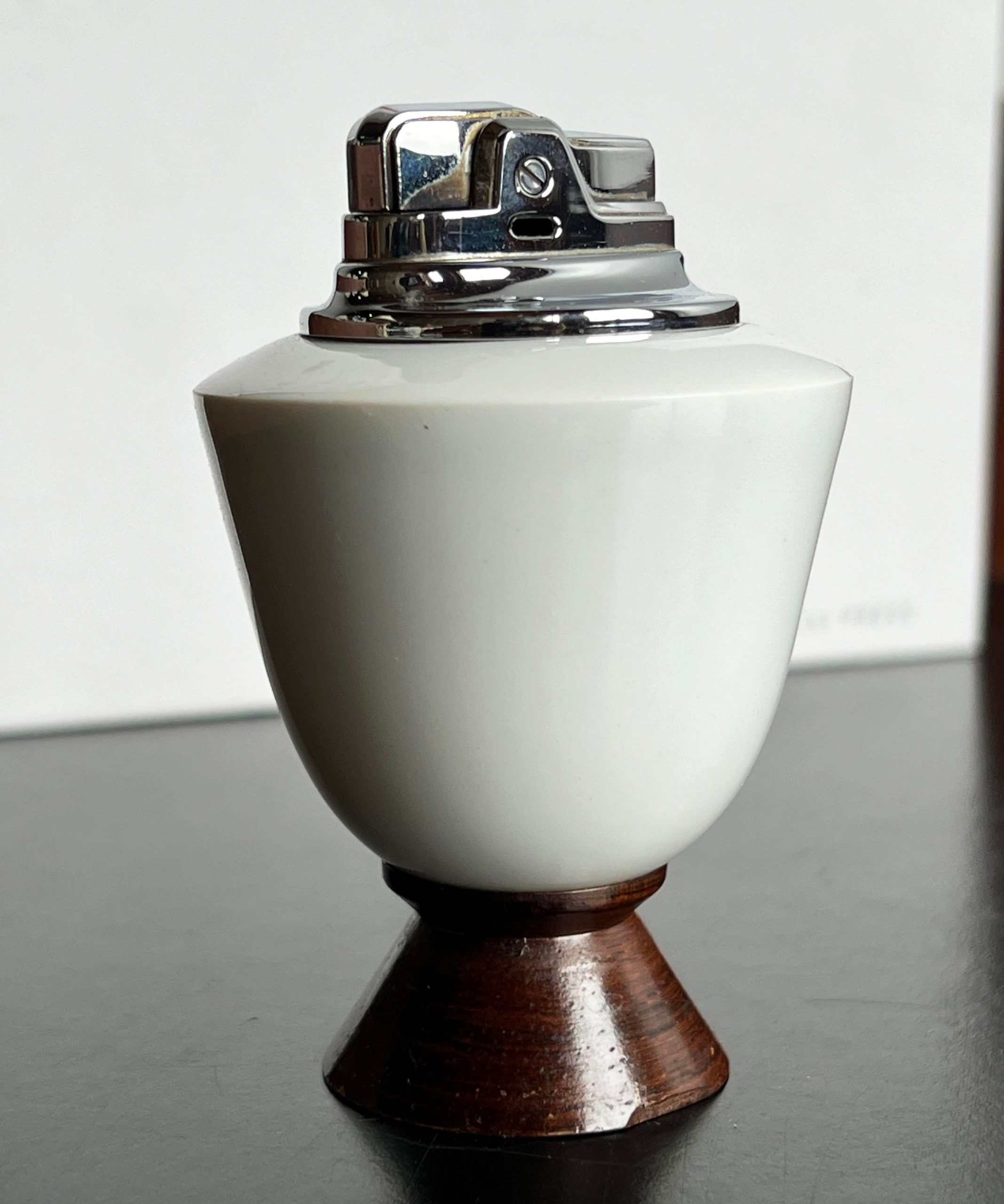 Wonderful mid century modern white ceramic & wood table lighter by Ronson, c.1950’s! Great simple form, very classic.
